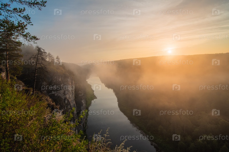 Туман над рекой и утесом на рассвете. Большие притесы на реке Ай