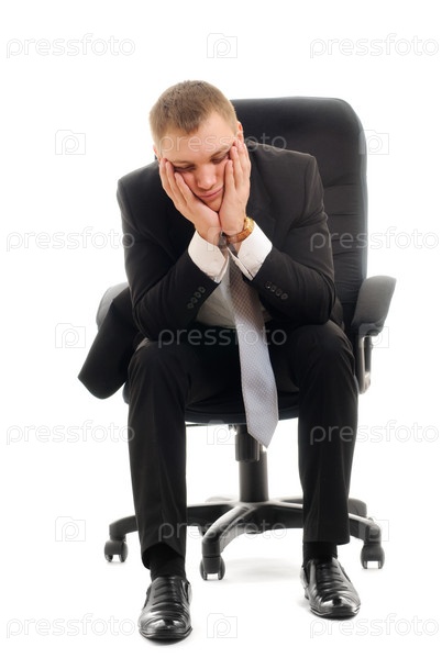 Деловой уставший мужчина сидит в кресле на белом фоне