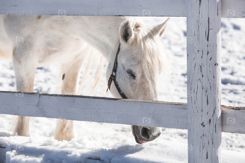 Красивый портрет белой лошади в загоне на ранчо зимним утром, на частной экоферме или в контактном зоопарке. Животноводство. Любовь к животным