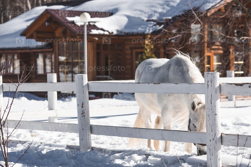 Красивый портрет белой лошади в загоне на ранчо зимним утром, на частной экоферме или в контактном зоопарке. Животноводство. Любовь к животным