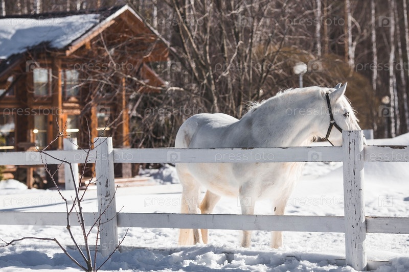 Красивый портрет белой лошади в загоне на ранчо зимним утром, на частной экоферме или в контактном зоопарке. Животноводство. Любовь к животным
