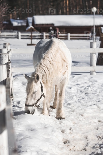 Красивый портрет белой лошади в загоне на ранчо зимним утром, на частной экоферме или в контактном зоопарке. Животноводство. Любовь к животным