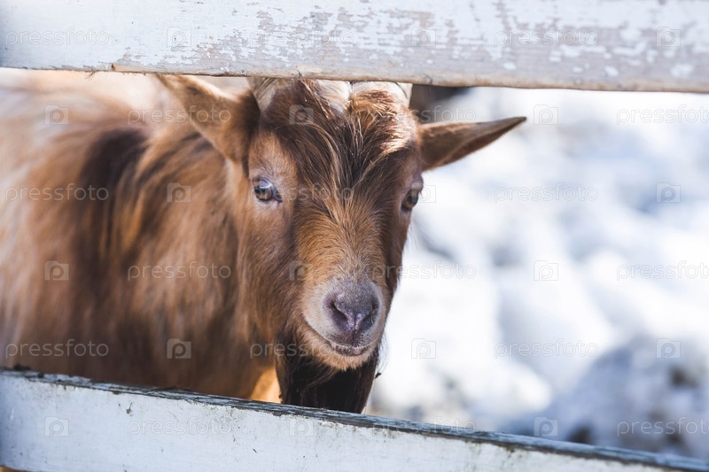 Домашний скот. Козы в загоне. Понятие животноводства и сельской жизни. Портрет улыбающейся козы на свежем воздухе. Крупный план. Домашний питомец на частной экоферме. Сельскохозяйственная промышленность