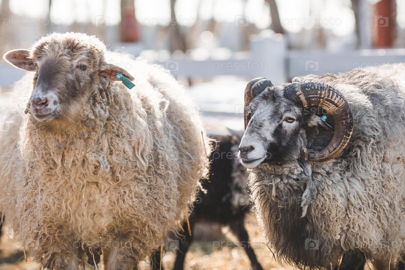Домашний скот. Баран и овца в загоне. Понятие животноводства и сельской жизни. Овцы на свежем воздухе. Крупный план. Домашний питомец на частной экоферме. Сельскохозяйственная промышленность
