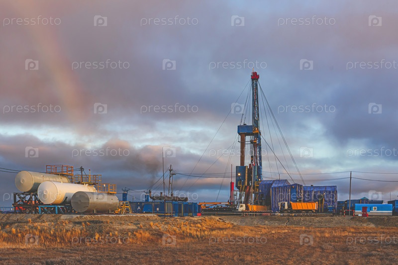 Инфраструктура для бурения нефтяных и газовых скважин на Крайнем Севере в Арктической зоне России. Осень. На переднем плане растительность полярной тундры. Красивое небо
