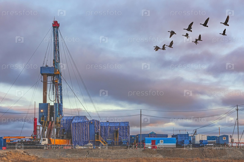 Инфраструктура для бурения нефтяных и газовых скважин на Крайнем Севере в Арктической зоне России. Осень. На переднем плане растительность полярной тундры. Красивое небо. Коллаж из стаи гусей