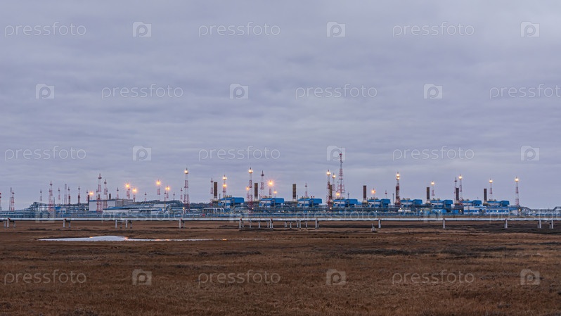 Инфраструктура комплексной установки по подготовке природного газа к транспортировке по газопроводу. Арктическая зона Сибири. Хмурое осеннее небо. На переднем плане полярная тундра