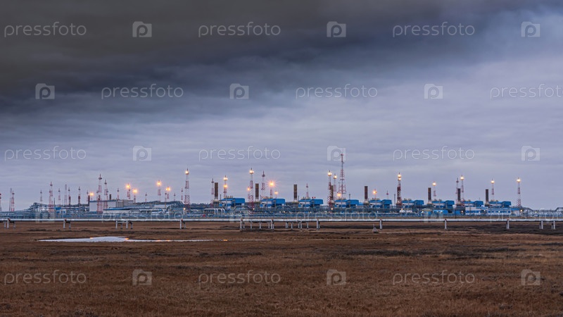 Инфраструктура комплексной установки по подготовке природного газа к транспортировке по газопроводу. Арктическая зона Сибири. Хмурое осеннее небо. На переднем плане полярная тундра