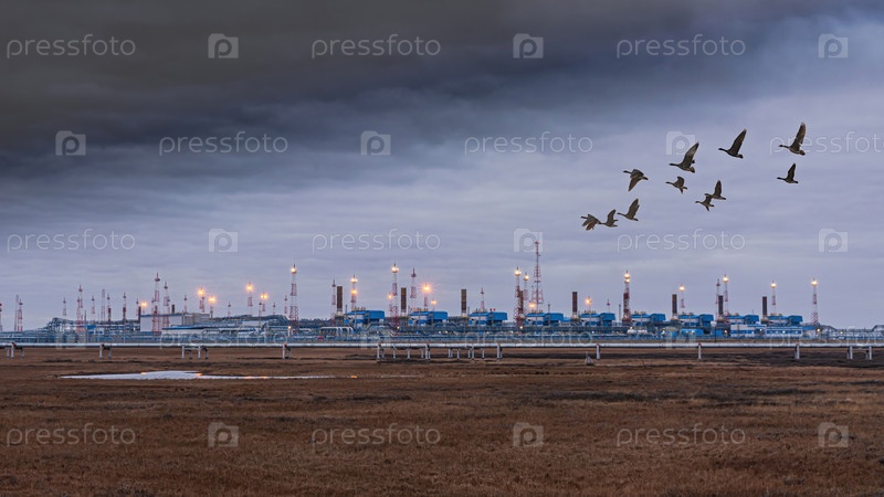 Инфраструктура комплексной установки по подготовке природного газа к транспортировке по газопроводу. Арктическая зона Сибири. Хмурое осеннее небо. На переднем плане – полярная тундра. Коллаж из стаи диких гусей