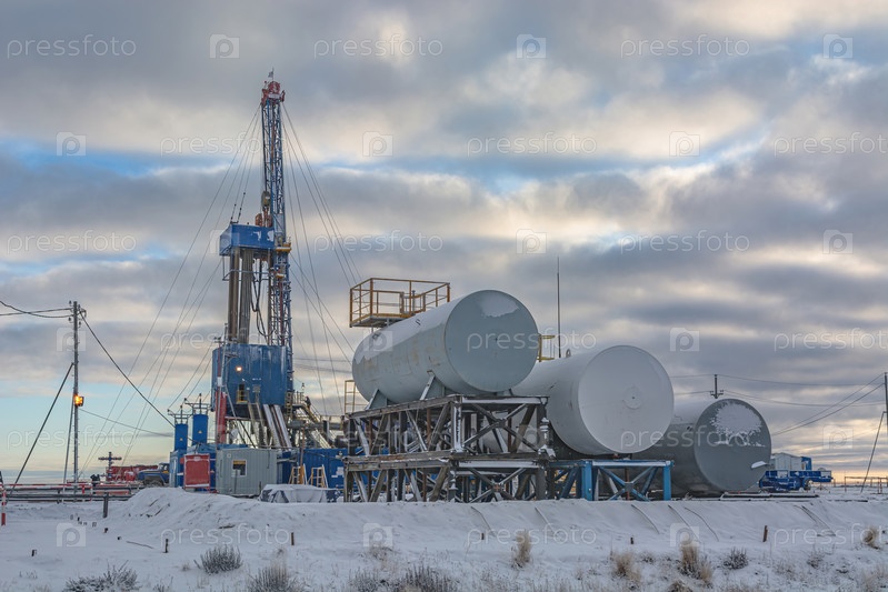 Бурение скважин на нефтегазовом месторождении на Крайнем Севере. Промышленная инфраструктура и буровая установка. Красивое зимнее небо. Полярный день