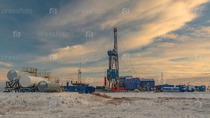 Бурение скважин на нефтегазовом месторождении на Крайнем Севере. Промышленная инфраструктура и буровая установка. Красивое зимнее небо. Полярный день