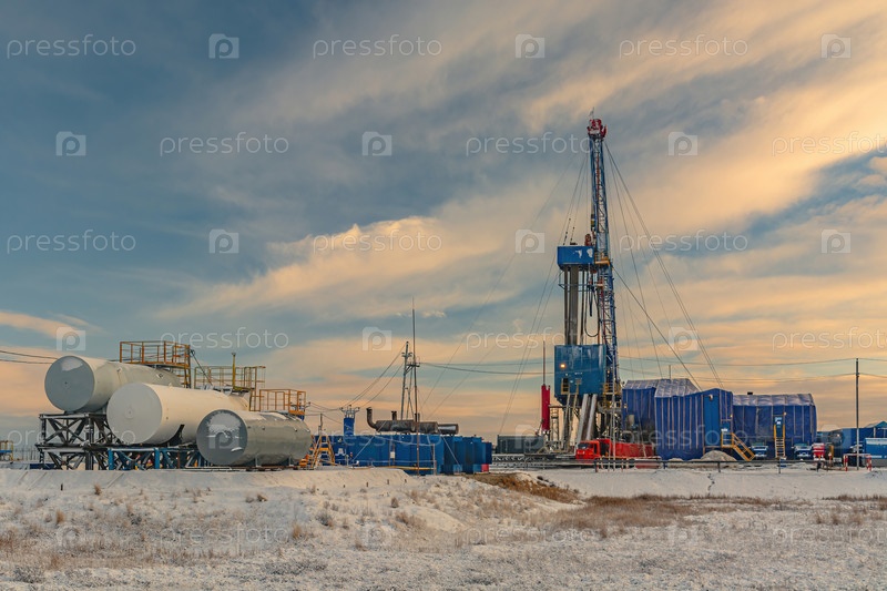 Бурение скважин на нефтегазовом месторождении на Крайнем Севере. Промышленная инфраструктура и буровая установка. Красивое зимнее небо. Полярный день