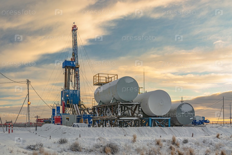 Бурение скважин на нефтегазовом месторождении на Крайнем Севере. Промышленная инфраструктура и буровая установка. Красивое зимнее небо. Полярный день