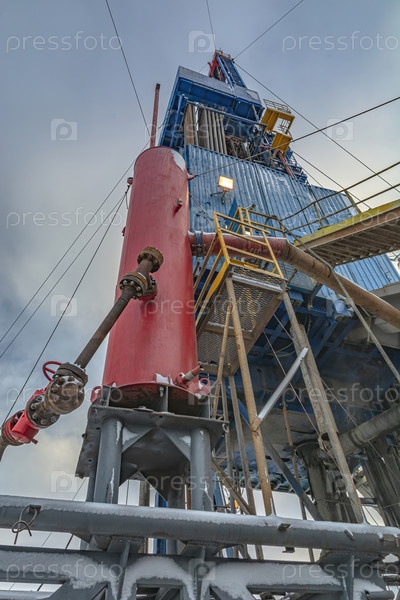 Буровая установка и буровое оборудование для бурения нефтяных и газовых скважин. Зимний день. Снег лежит на конструкциях установки. Голубое облачное небо