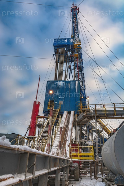 Буровая установка и буровое оборудование для бурения нефтяных и газовых скважин. Зимний день. Снег лежит на конструкциях установки. Голубое облачное небо