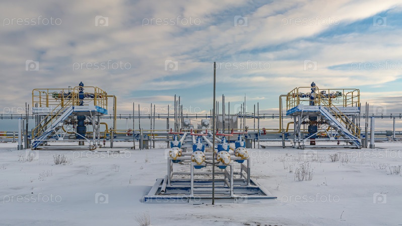 Инфраструктура куста газодобывающих скважин на месторождениях Крайнего Севера. Полярный зимний день. Скважинное оборудование и трубопроводы покрыты снегом