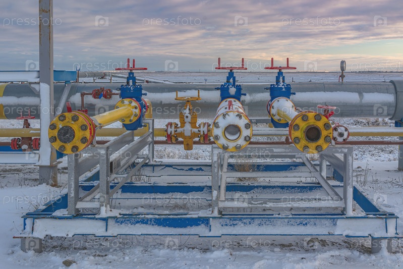 Инфраструктура куста газодобывающих скважин на месторождениях Крайнего Севера. Полярный зимний день. Скважинное оборудование и трубопроводы покрыты снегом