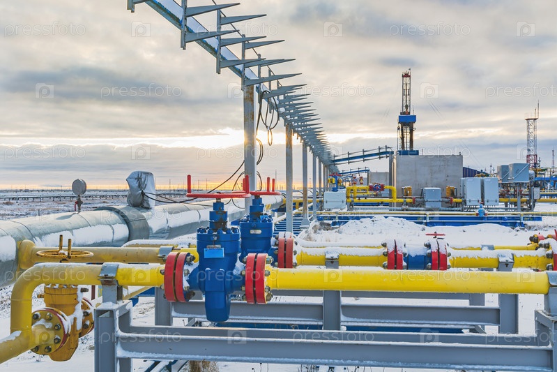 Инфраструктура куста газодобывающих скважин на месторождениях Крайнего Севера. Полярный зимний день. Скважинное оборудование и трубопроводы покрыты снегом