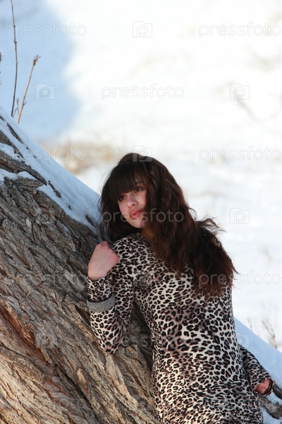 Задумчивая девушка возле дерева зимой