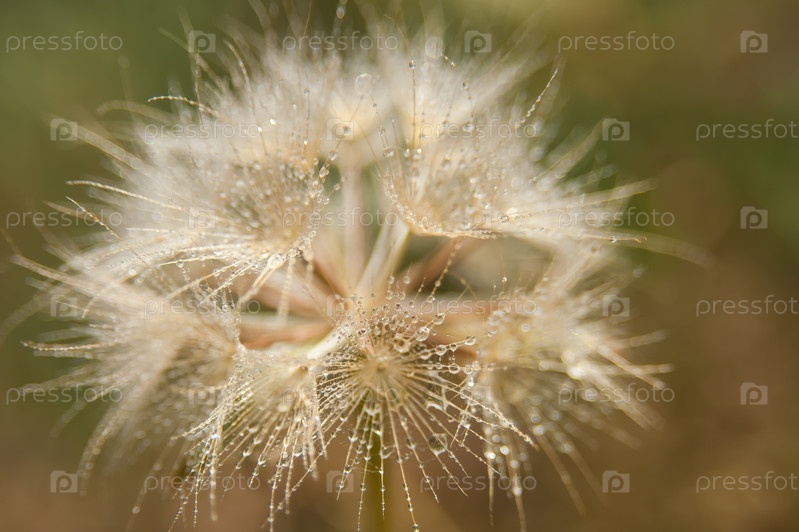 Белый одуванчик с каплями воды крупным планом