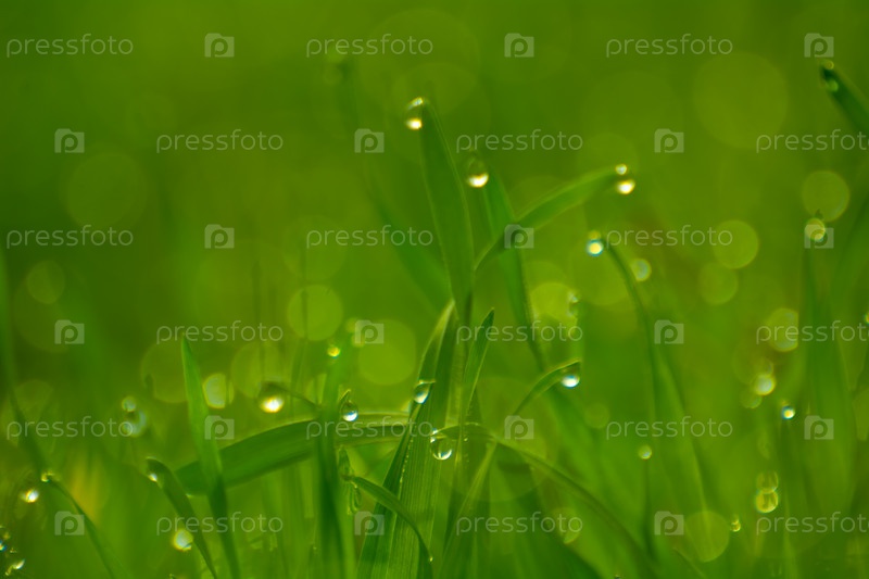 Утренняя роса на весенней зеленой траве, капельках воды