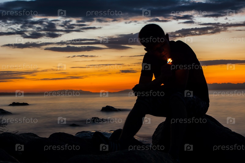 Темный силуэт людей на закате озера Иссык-Куль