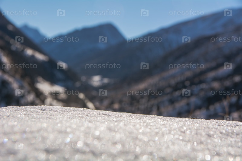 Горное ущелье Ала-Арча, Кыргызстан, солнечный снежный фон, выборочный фокус
