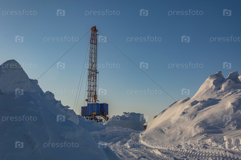 Северное газовое месторождение. На переднем плане много снега. На заднем плане - мобильная установка для ремонта скважин. Морозный зимний день. Солнечное голубое небо