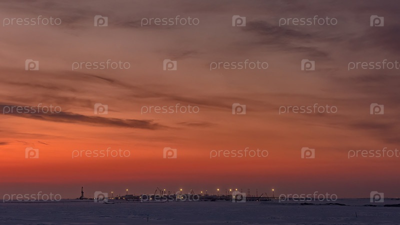 Газовое месторождение в Арктике. На горизонте находится инфраструктура добычи газа. Красивое небо зимнего полярного заката