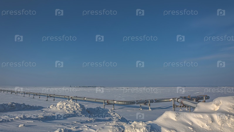 Газовое месторождение в Арктике. На переднем плане — магистральный газопровод. Зимний полярный день. На заднем плане — инфраструктура газодобывающего оборудования и объектов