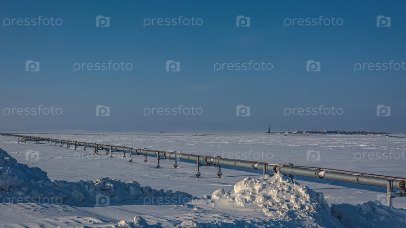 Газовое месторождение в Арктике. На переднем плане — магистральный газопровод. Зимний полярный день. На заднем плане — инфраструктура газодобывающего оборудования и объектов