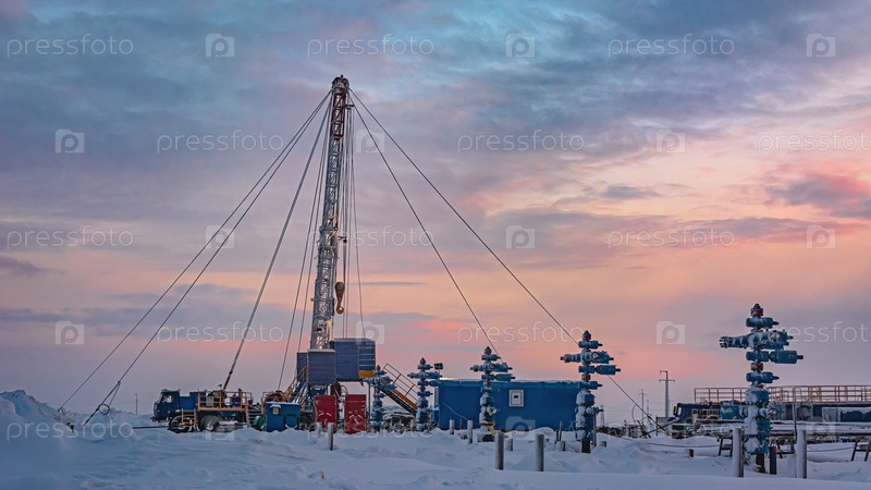 Северное газовое месторождение. На переднем плане ряд газодобывающих скважин. На заднем плане мобильная установка для ремонта скважин. Морозный зимний день. Земля покрыта снегом