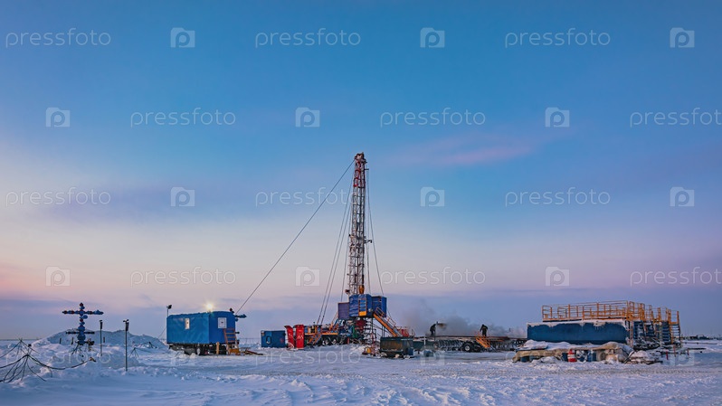 Ремонт скважины на газовом месторождении в Арктике. Зимний полярный день. Мороз. Снег. Мобильная установка для ремонта скважин с вышкой и другим оборудованием