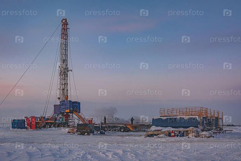 Ремонт скважины на газовом месторождении в Арктике. Зимний полярный день. Мороз. Снег. Мобильная установка для ремонта скважин с вышкой и другим оборудованием