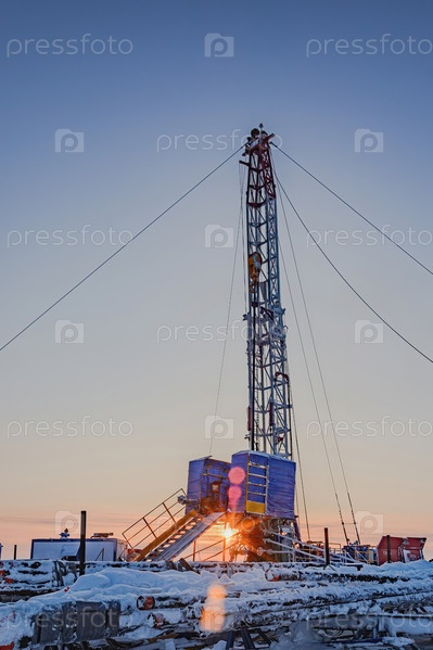 Ремонт скважины на газовом месторождении в Арктике. Зимний полярный вечер. Мороз. Снег. Мобильная установка для ремонта скважин с вышкой и другим оборудованием