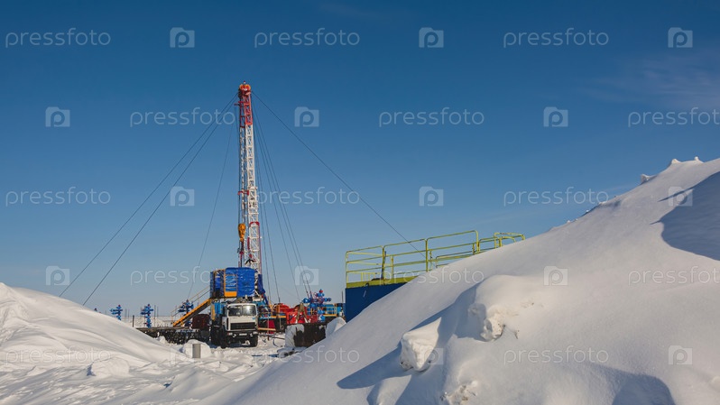 Северное газовое месторождение. На переднем плане много снега. На заднем плане - мобильная установка для ремонта скважин. Морозный зимний день. Солнечное голубое небо