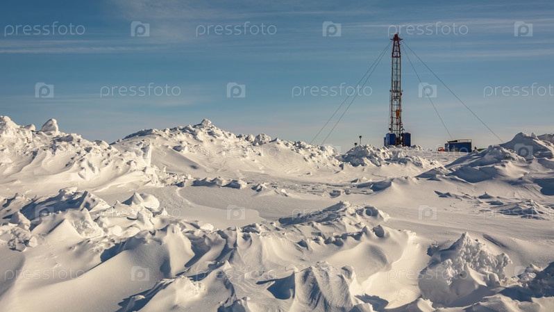 Северное газовое месторождение. На переднем плане много снега. На заднем плане - мобильная установка для ремонта скважин. Морозный зимний день. Солнечное голубое небо