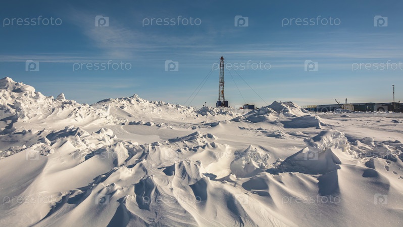 Северное газовое месторождение. На переднем плане много снега. На заднем плане - мобильная установка для ремонта скважин. Морозный зимний день. Солнечное голубое небо