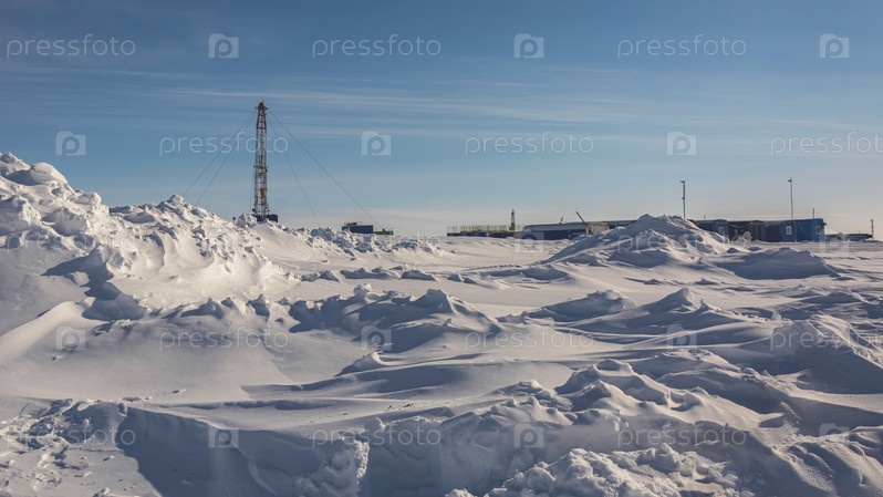 Северное газовое месторождение. На переднем плане много снега. На заднем плане - мобильная установка для ремонта скважин. Морозный зимний день. Солнечное голубое небо