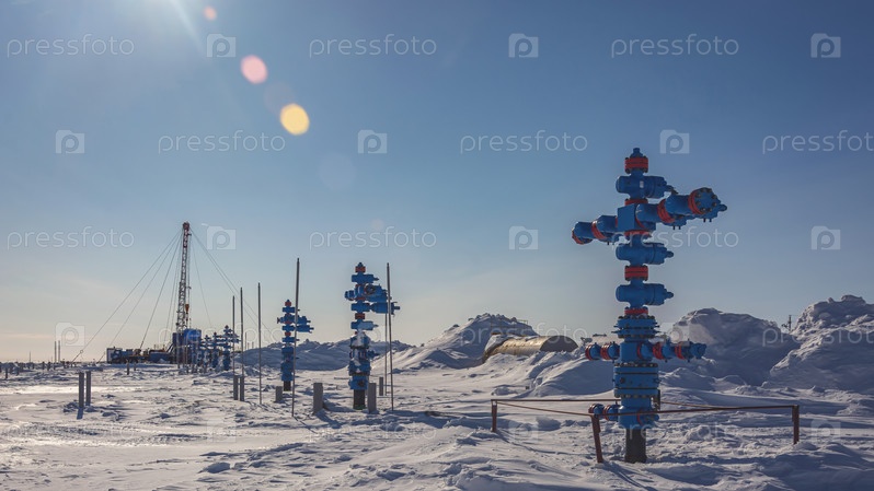 Северное газовое месторождение. На переднем плане ряд газодобывающих скважин. На заднем плане мобильная установка для ремонта скважин. Морозный зимний день. Земля покрыта снегом
