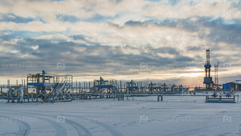 Инфраструктура куста газодобывающих скважин на месторождениях Крайнего Севера. Полярный зимний день. Скважинное оборудование и трубопроводы покрыты снегом