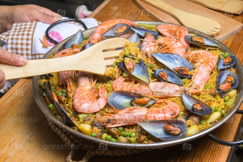 Паэлья из морепродуктов с креветками и мидиями на сковороде, готовая к подаче деревянной посудой, типичная испанская кухня, Майорка, Балеарские острова, Испания,