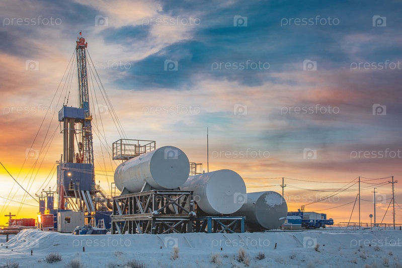 Оборудование и инфраструктура буровой установки для бурения нефтяных и газовых скважин на месторождениях Северного региона. На заднем плане красочное небо в начале полярного дня