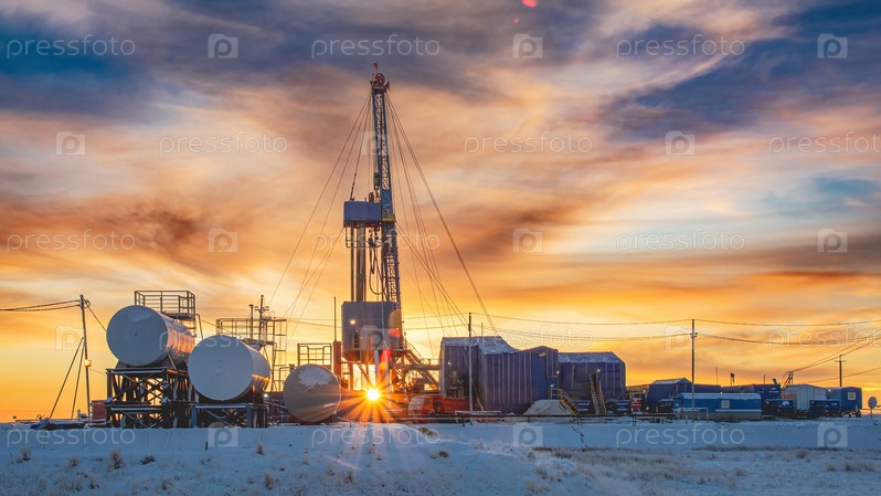 Оборудование и инфраструктура буровой установки для бурения нефтяных и газовых скважин на месторождениях Северного региона. На заднем плане красочное небо в начале полярного дня