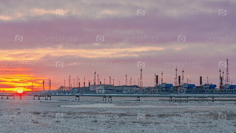 Инфраструктура комплексной установки по подготовке природного газа к транспортировке по газопроводу. Арктическая зона Сибири. Небо полярного дня. На переднем плане заснеженная тундра