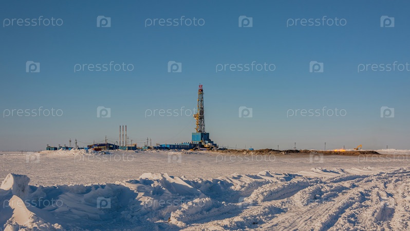 Газовое месторождение в Арктике. Полярный зимний день. На переднем плане заснеженная тундра. На заднем плане буровая установка и промышленная инфраструктура