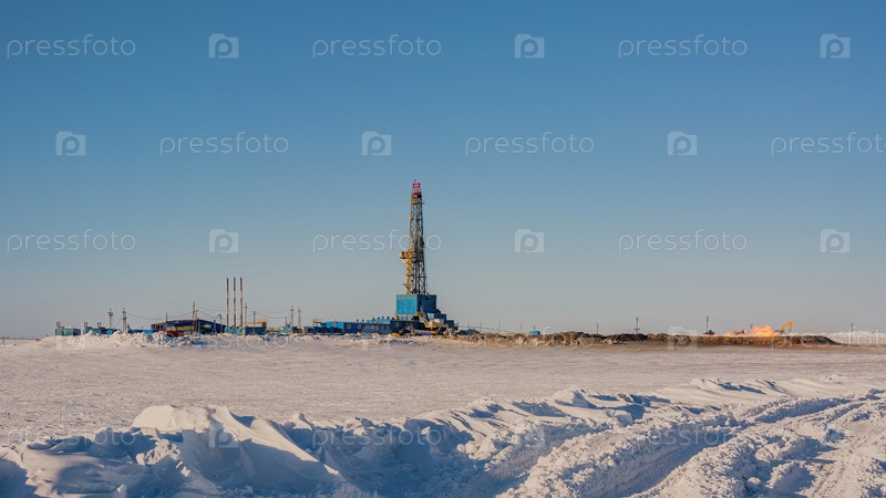 Газовое месторождение в Арктике. Полярный зимний день. На переднем плане заснеженная тундра. На заднем плане буровая установка и промышленная инфраструктура