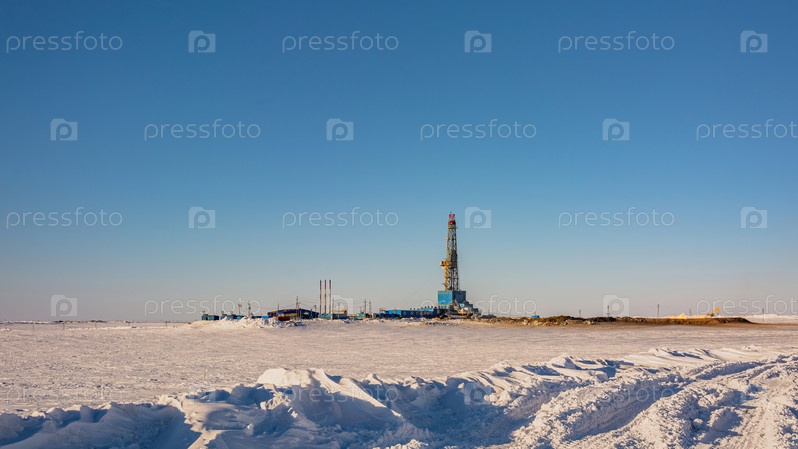 Газовое месторождение в Арктике. Полярный зимний день. На переднем плане заснеженная тундра. На заднем плане буровая установка и промышленная инфраструктура