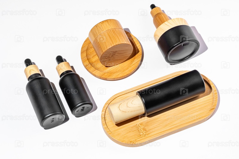 Набор косметических продуктов в упаковке из черного и бамбукового стекла. Косметическое масло в бутылочке-капельнице и баночках с кремом для здоровой кожи. Небрендовая упаковка для продвижения косметики. Стиль кноллинга, вид сверху