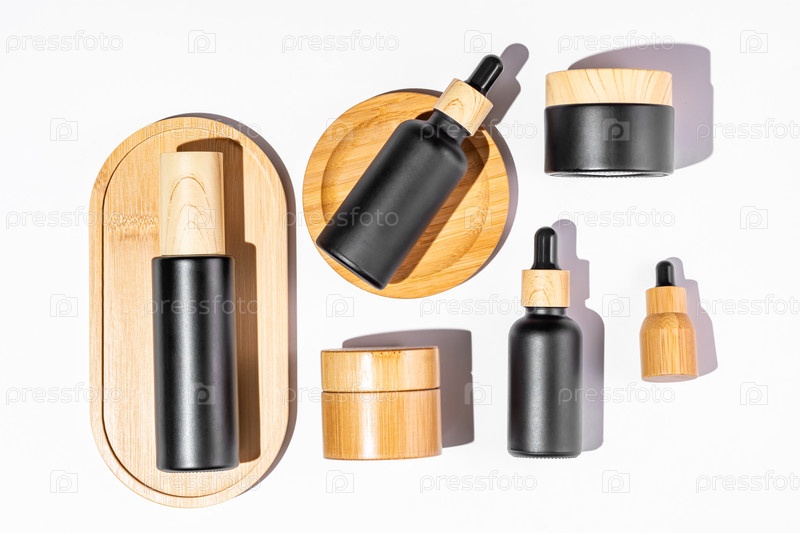 Естественная косметика в черной стеклянной упаковке на белом фоне с тенями от солнца. Набор органических косметических продуктов SPA. Концепция ухода за кожей, холм